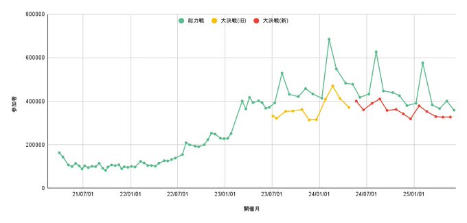 大決戦327328人(22:シロクロ)、最高470255人(07:KAITEN)