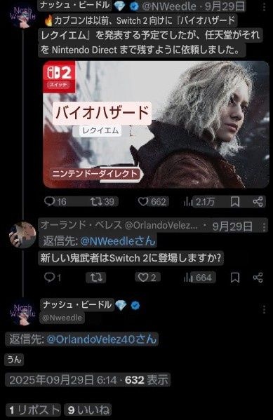 海外リーカー「スイッチ2版バイオ9はもっと早くに発表される予定だった。遅れたのは任天堂からの依頼」