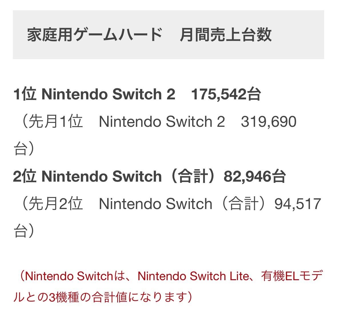 【ファミ通】2025年9月ハード売上 1位 Switch2 175,542台、2位 Switch 82,946台