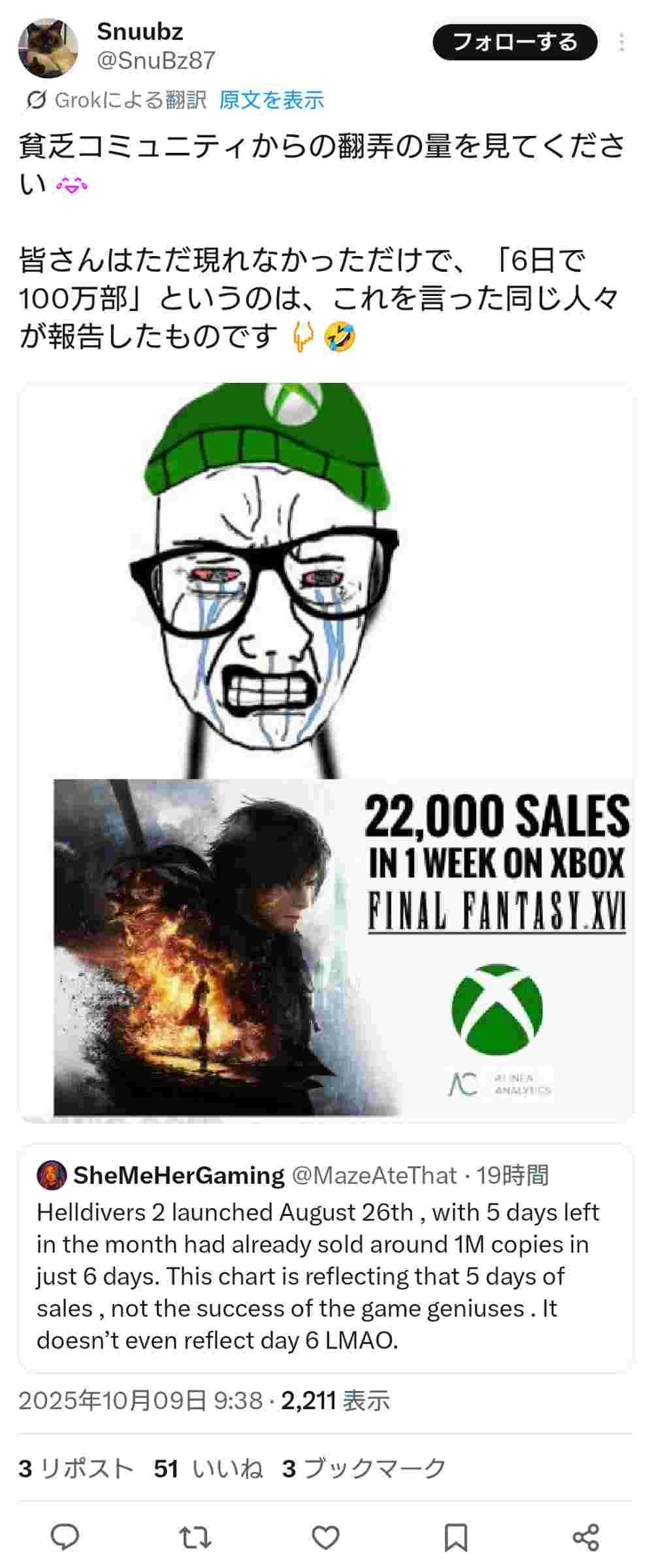 チカ「XBOXではゲームが売れる!PS5よりヘルダイバーが売れた!」