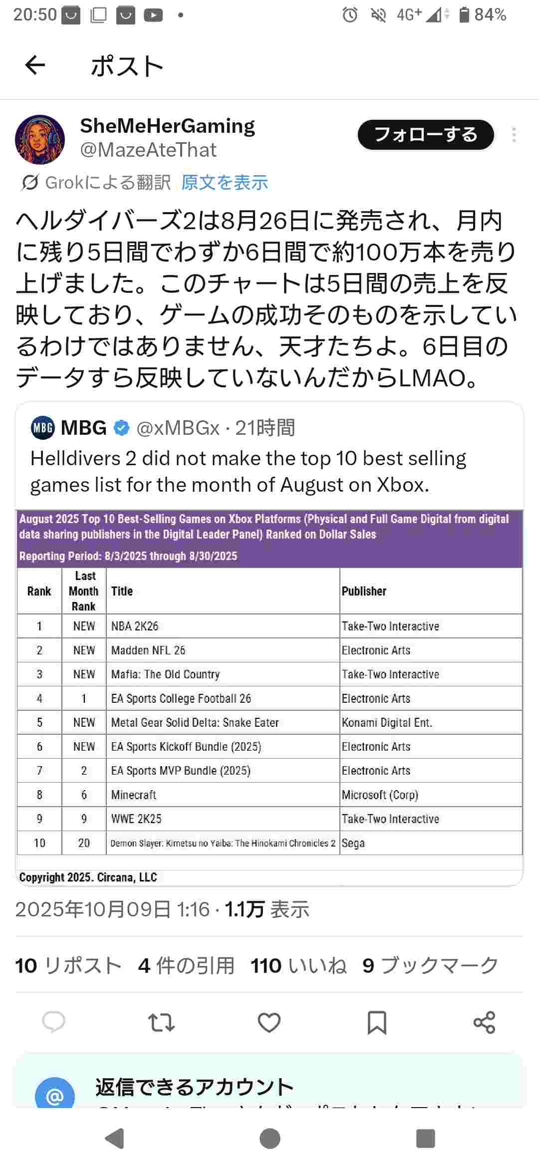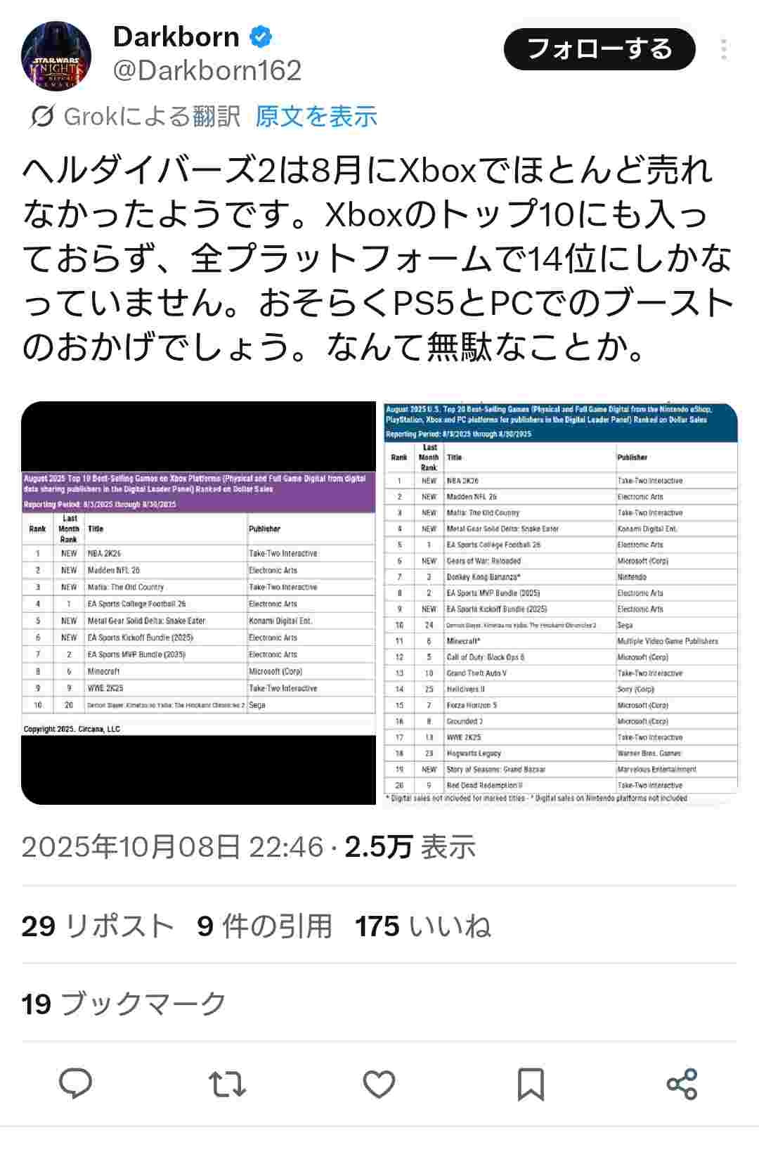 どうやら、8月のHelldivers 2はXboxでほとんど売れなかったようです。Xboxの売上トップ10にも入らず、全プラットフォームの中では14位に留まりました。おそらくPS5とPCの売上が伸びたおかげでしょう。本当にもったいないですね。