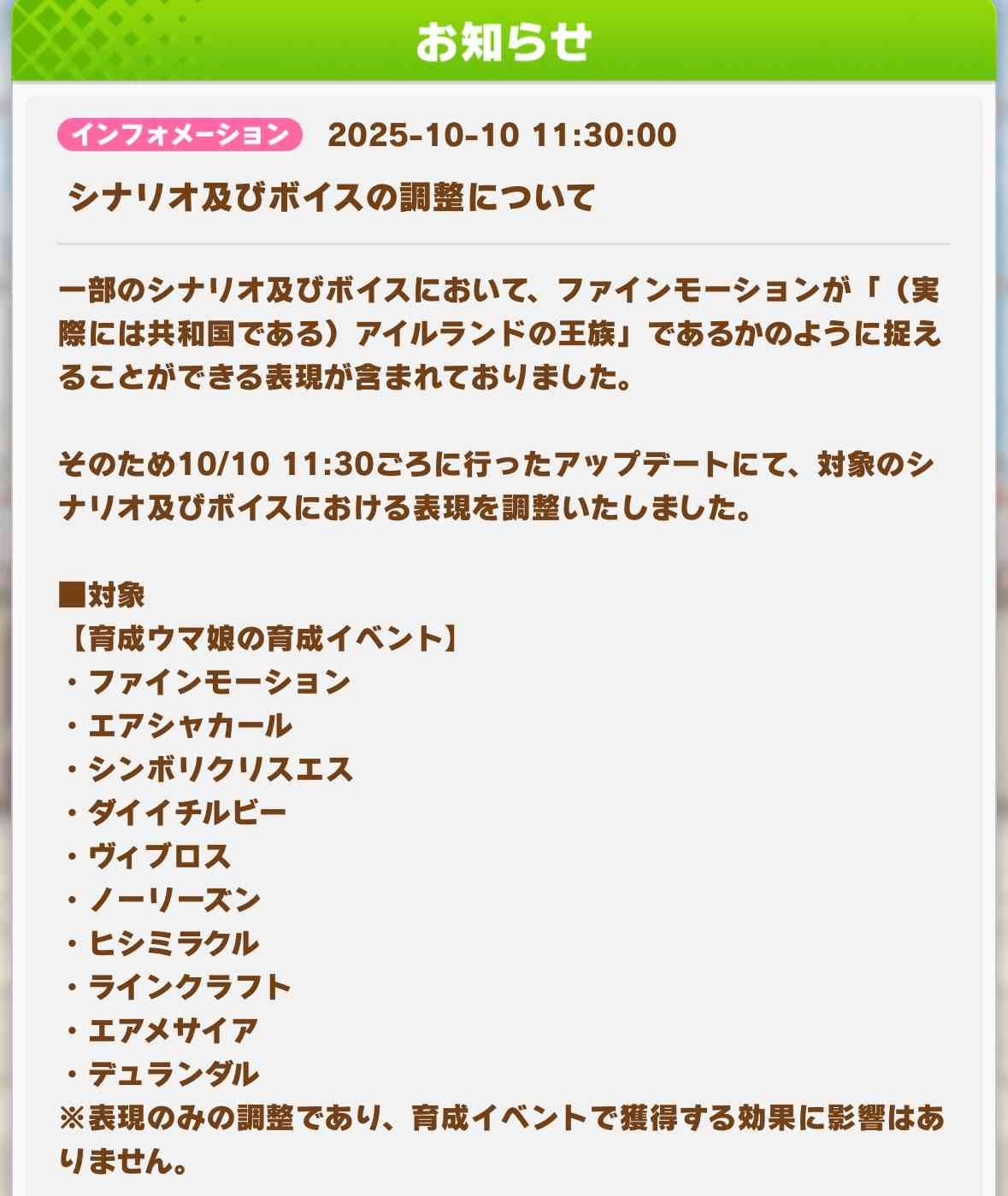 『ウマ娘』に登場する「ファインモーション」の設定が一部調整へ。「(実際には共和国である)アイルランドの王族」であるかのように捉えることができる表現があったため。“さる国の王家の血脈を継ぐお方”で、現在一族はアイルランドに定住という表現に