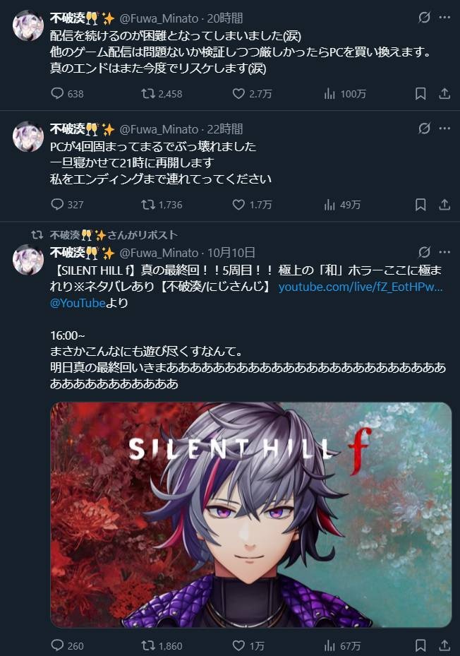 超人気Vtuber、サイレントヒルfの配信で4回クラッシュしてまるでPCがぶっ壊れた模様