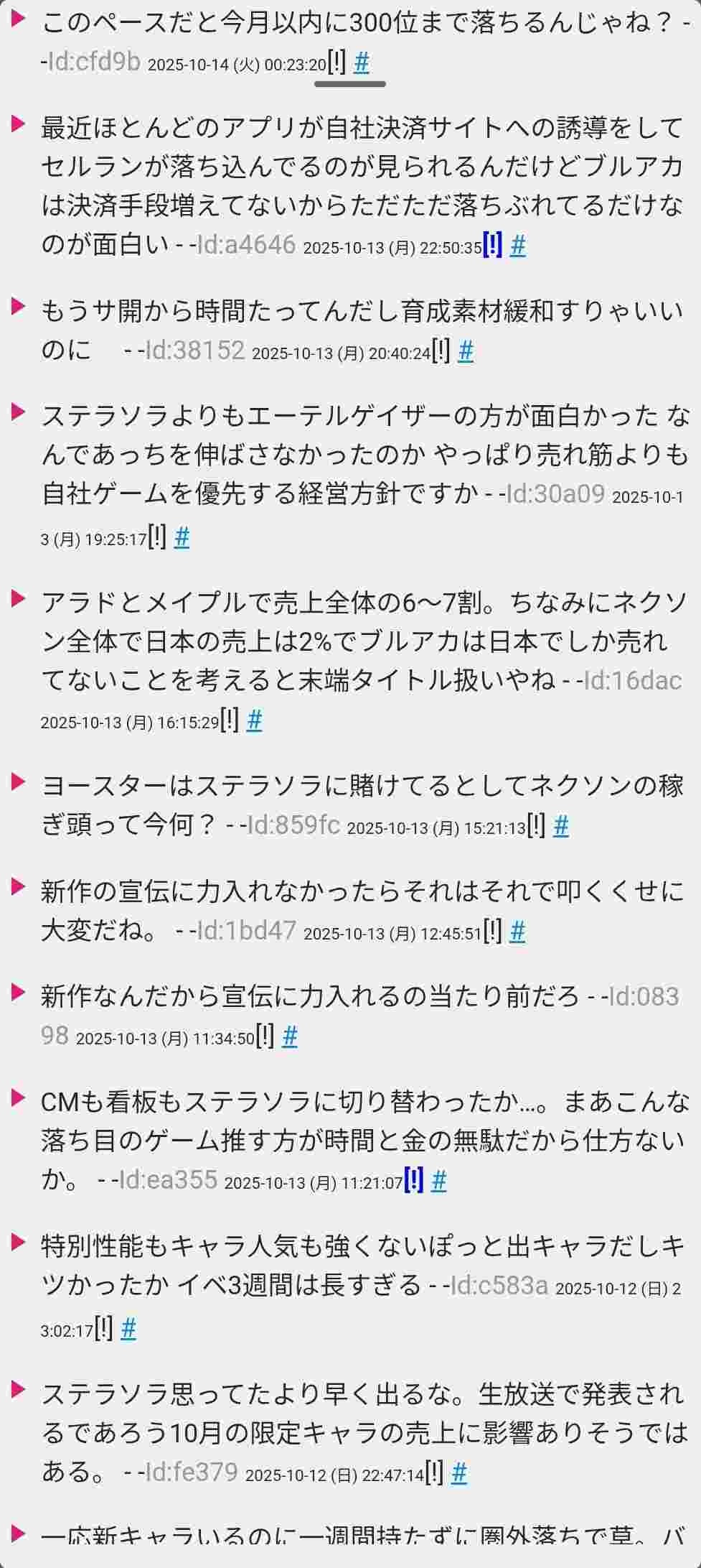 今年入ってからちょっとイラストレーターに案件で描いてもらった一枚絵がAI疑惑かけられてイベントシナリオの翻訳がめちゃくちゃでリアイベの金賞受賞したユーザー動画が気持ち悪い内容で既存キャラの衣装違いばっかで新キャラが実装されずに夏イベとメインの背景が明らかにAI製で4年目にもなってメンテ延長は連発するし言い訳としてサーバー攻撃を受けてたはずなのに1時間以上鯖閉じずに一部ユーザーはプレイ可能な環境で放置したりアニメ化が大失敗してその後の生放送でも触れられなかったりメインシナリオが5分割に更新小分けした挙句クソシナリオでガチャキャラのバグが未だに声明無しで放置されて虚無期間が増えて復刻連発してブルアカ運営の主要スタッフとイラストレーターの大勢が退社してプロジェクトKVに移動した上にブルーアーカイブのグローバル版生放送で台湾・香港を国として扱って中国で大炎上してるだけじゃん… - 74 : 2025/10/14(火) 06:56:07.971 ID:AfQJlEMpE