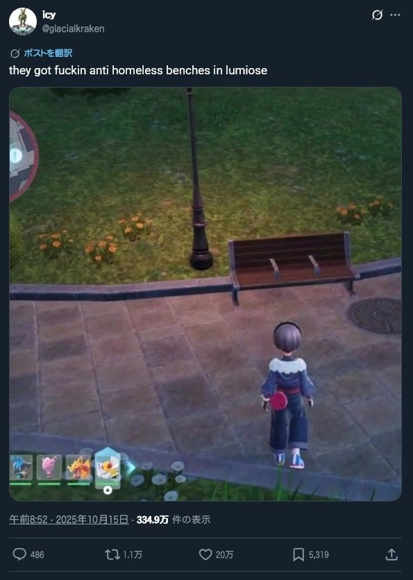 ポケモンZA、街のベンチがホームレス排除仕様であることが判明し海外で炎上してしまうwww