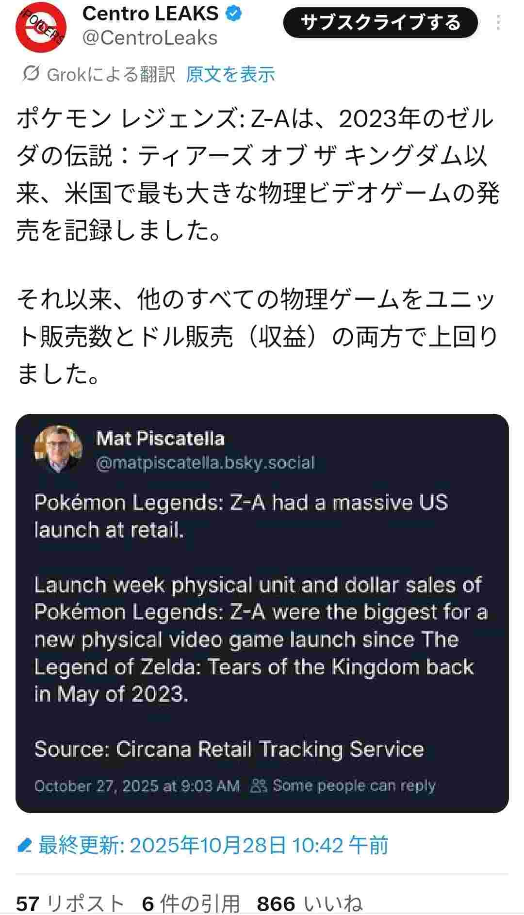 「ポケモンZAは米国で2023年のTotk以来最も大きな物理ビデオゲームの販売となった」