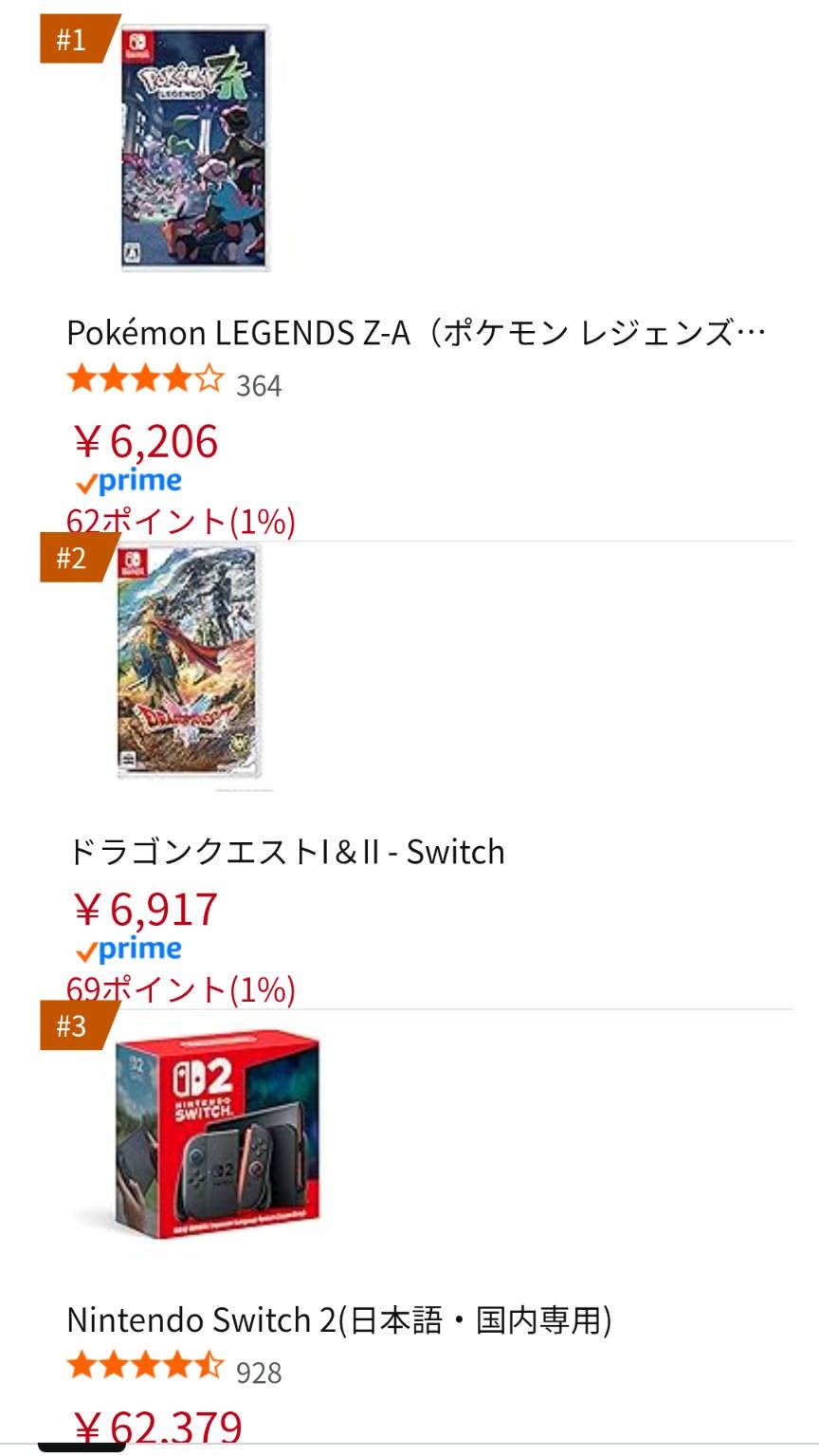 ポケモンレジェンズZA、明日発売のドラクエ1&2を抑えてAmazonランキング1位キープ