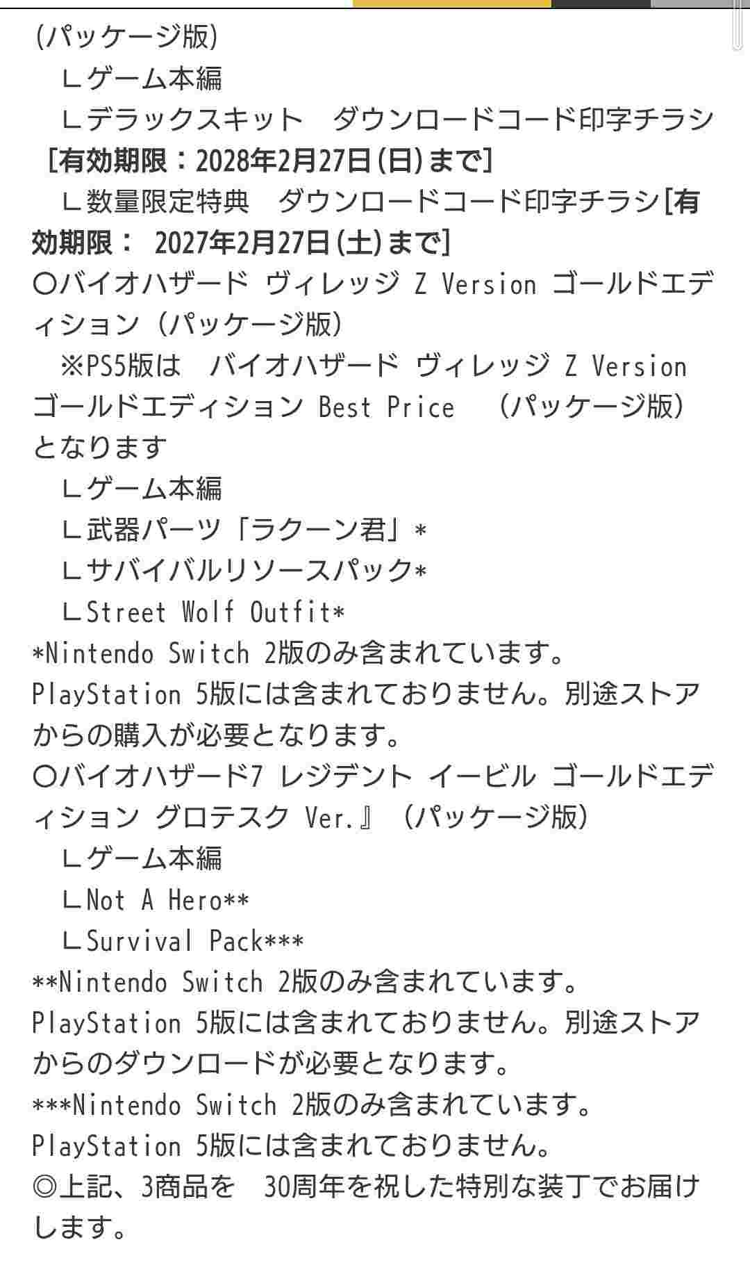 バイオ30周年セットでswitch2に入ってるコンテンツがPS5だと別購入に