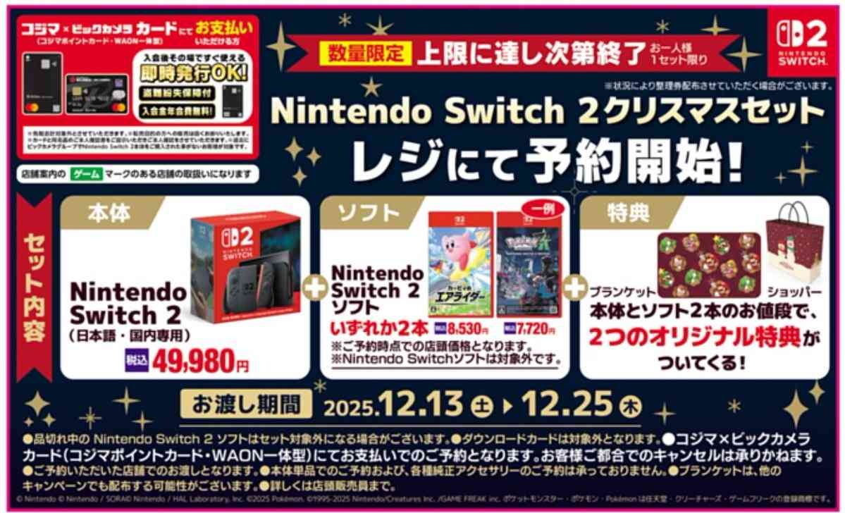 コジマ×ビックカメラでSwitch2のクリスマスセットを予約しなきゃ…https://x.com/4t8jvjimheohiem/status/1984447397096014302