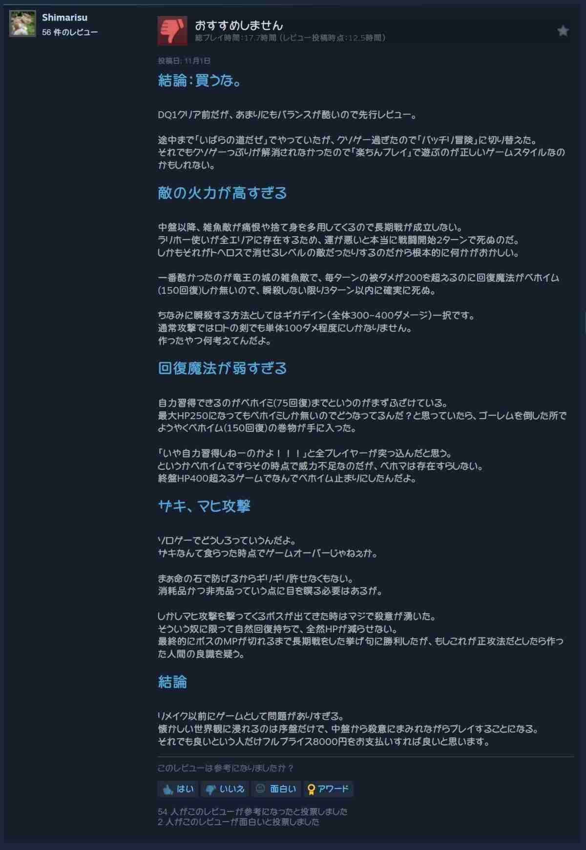 - 元々ドラクエ1なんてまともに評価すら出来ないようなゲームやったからかなり遊べるようにはなってると思うんやけどなあ