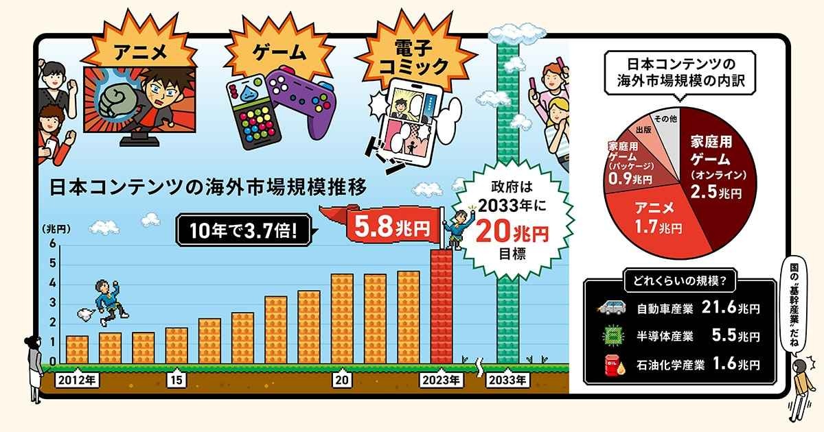 - 日本のアニメーション、ゲームなどのコンテンツは国境を越えてファンが広がり、海外でも評価が高い。コンテンツ産業の海外売上高は2023年で過去最高の5.8兆円。鉄鋼産業や半導体産業を上回り、10年で3.7倍に膨らんだ。政府は不足する人材育成を支援し、成長産業を後押しする。