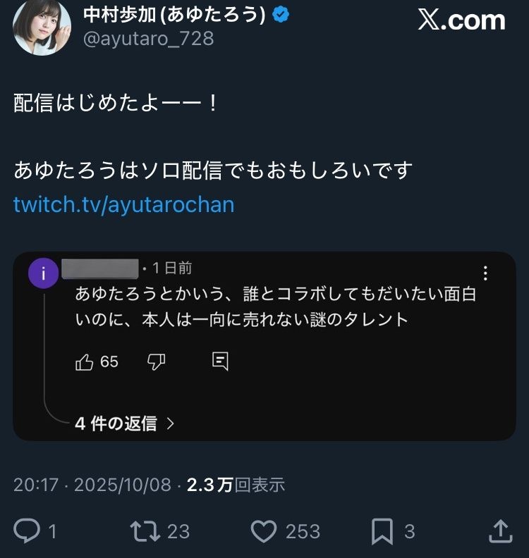 - 加藤純一さんと同じ番組に出て登録者爆伸びする中村歩加さん