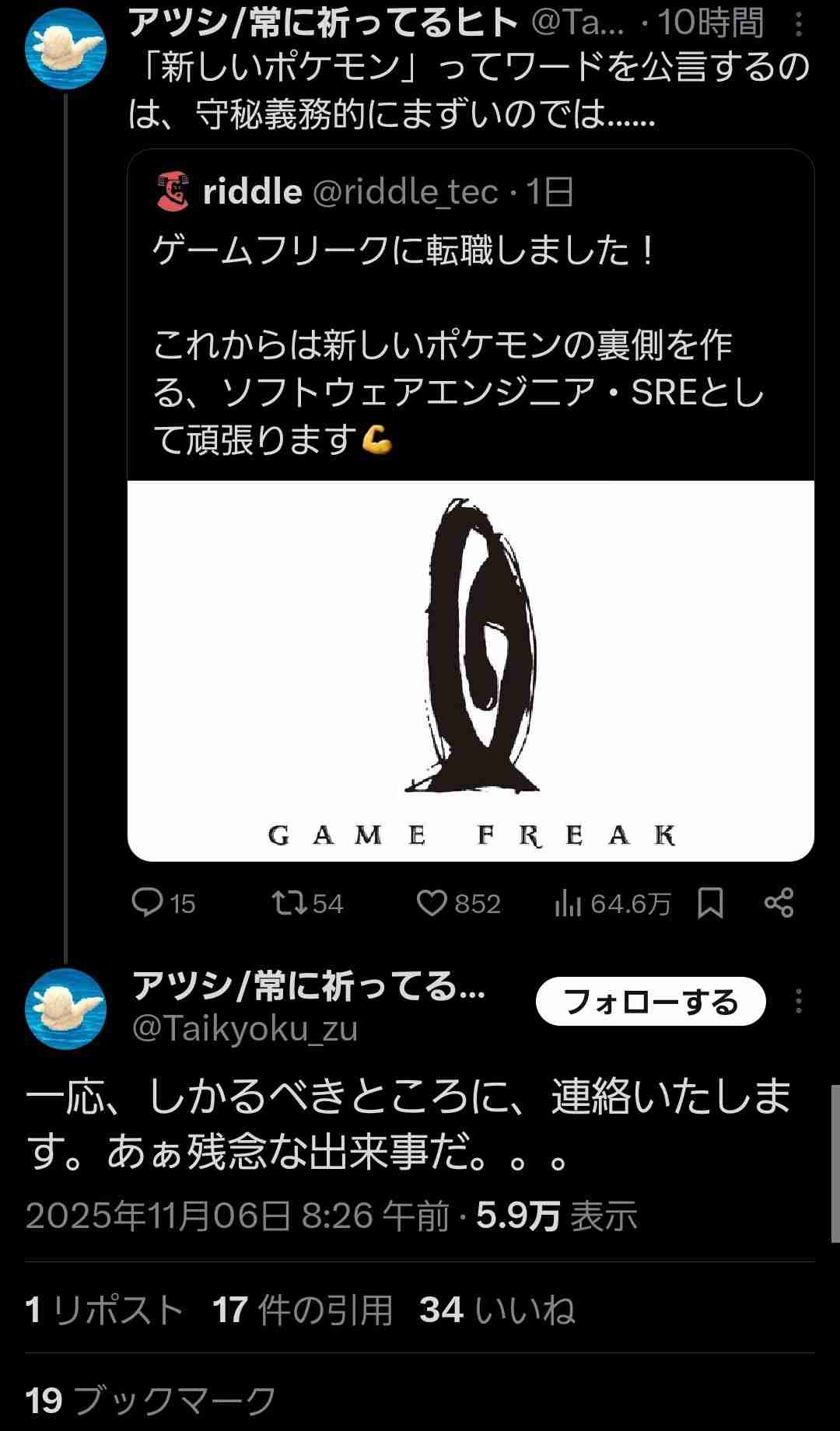 新卒「ゲーフリに入社!新しいポケモン開発頑張るぞ!」元ゲーフリ社員「守秘義務違反で通報したわ」
