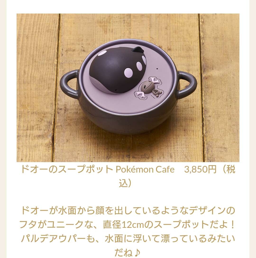 ドオーのスープポット Pokémon Cafe 3,850円(税込)ドオーが水面から顔を出しているようなデザインのフタがユニークな、直径12cmのスープポットだよ!
