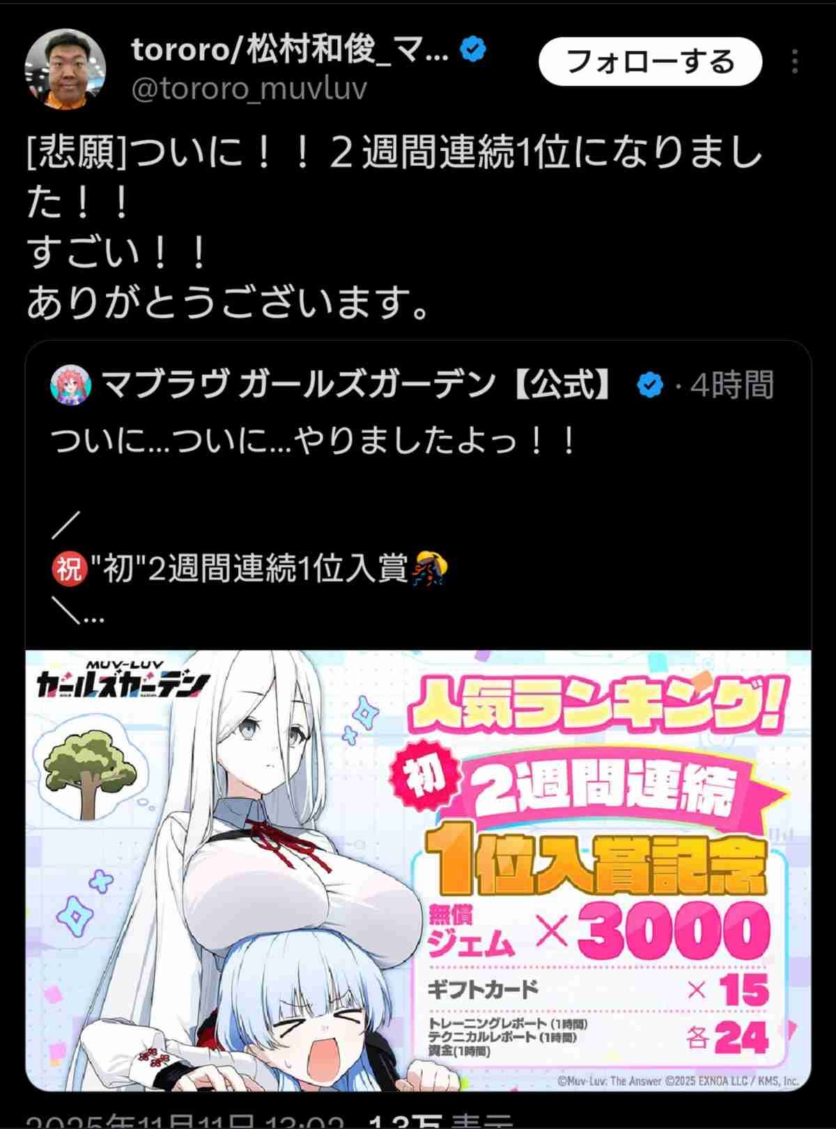 - 2週間連続1位の快挙はXでニュースにもなっとる