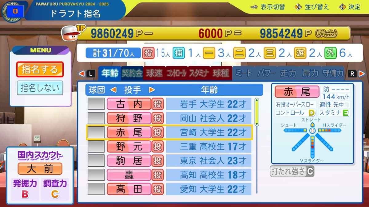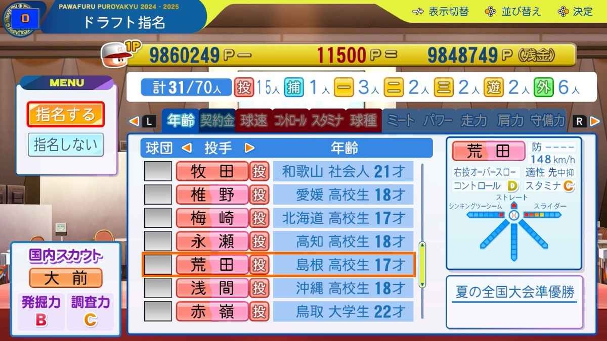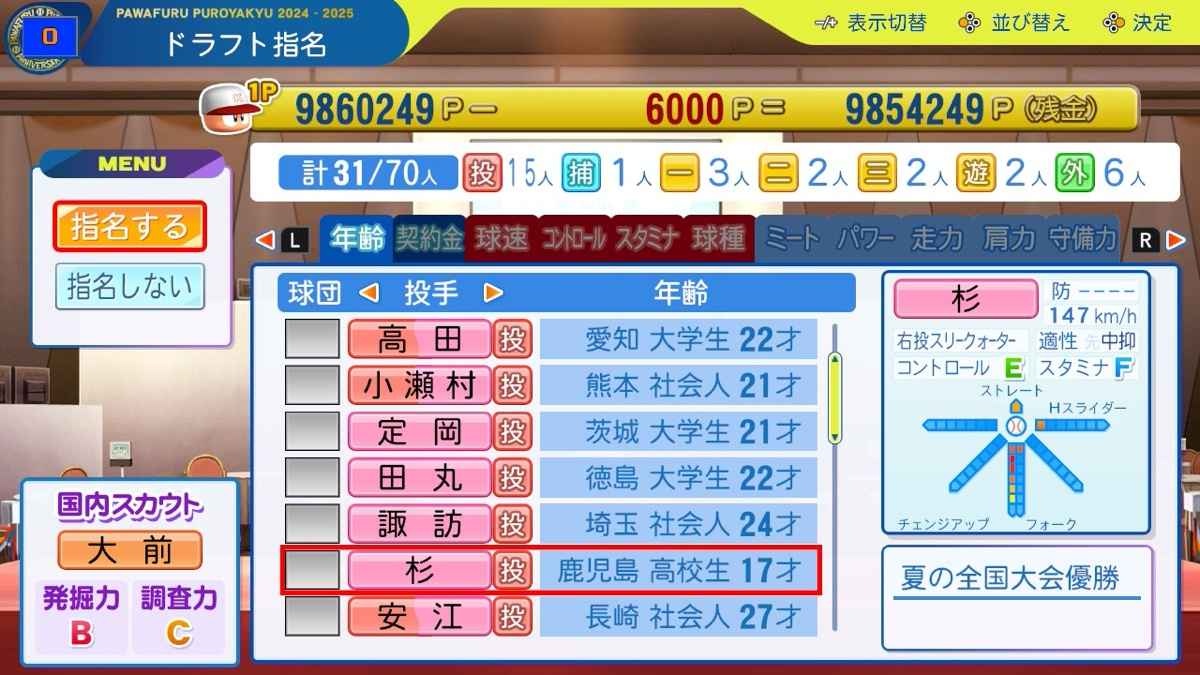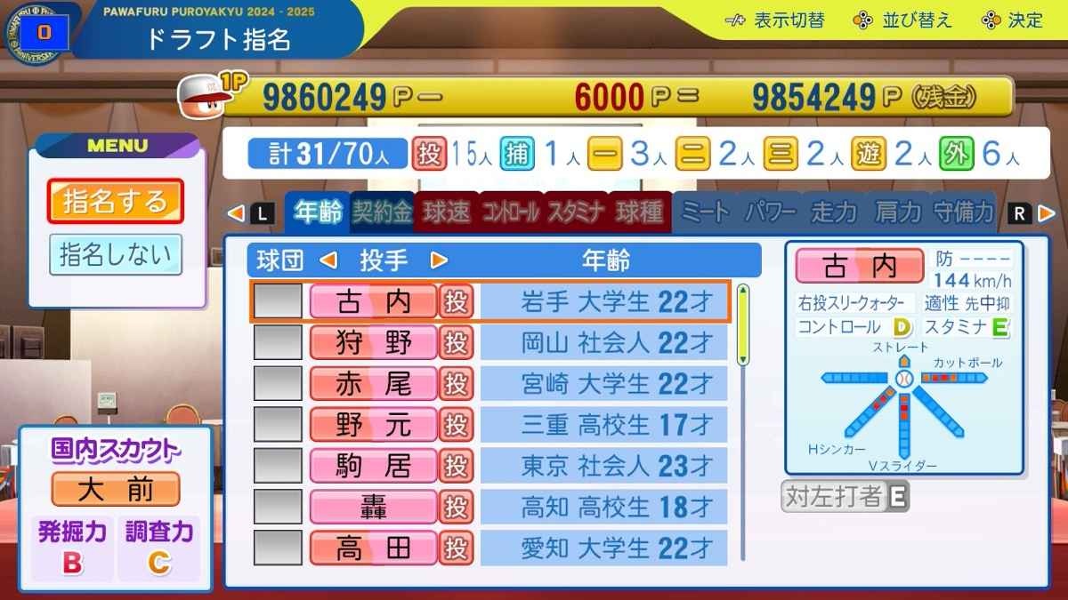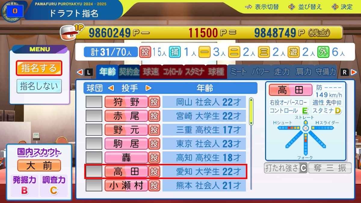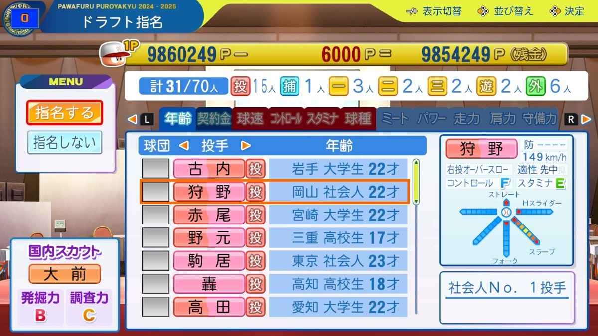 1位指名&2位指名選手のみ3球種目を覚えさせることができる