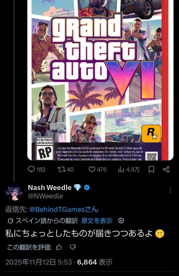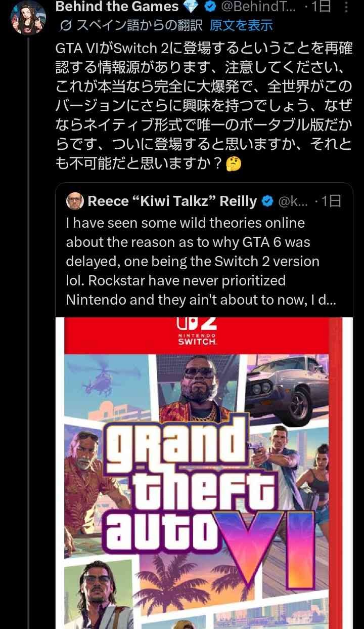 Switch2版弥助をリークした海外リーカー「Switch2版GTA6について私にちょっとしたものが届いている」