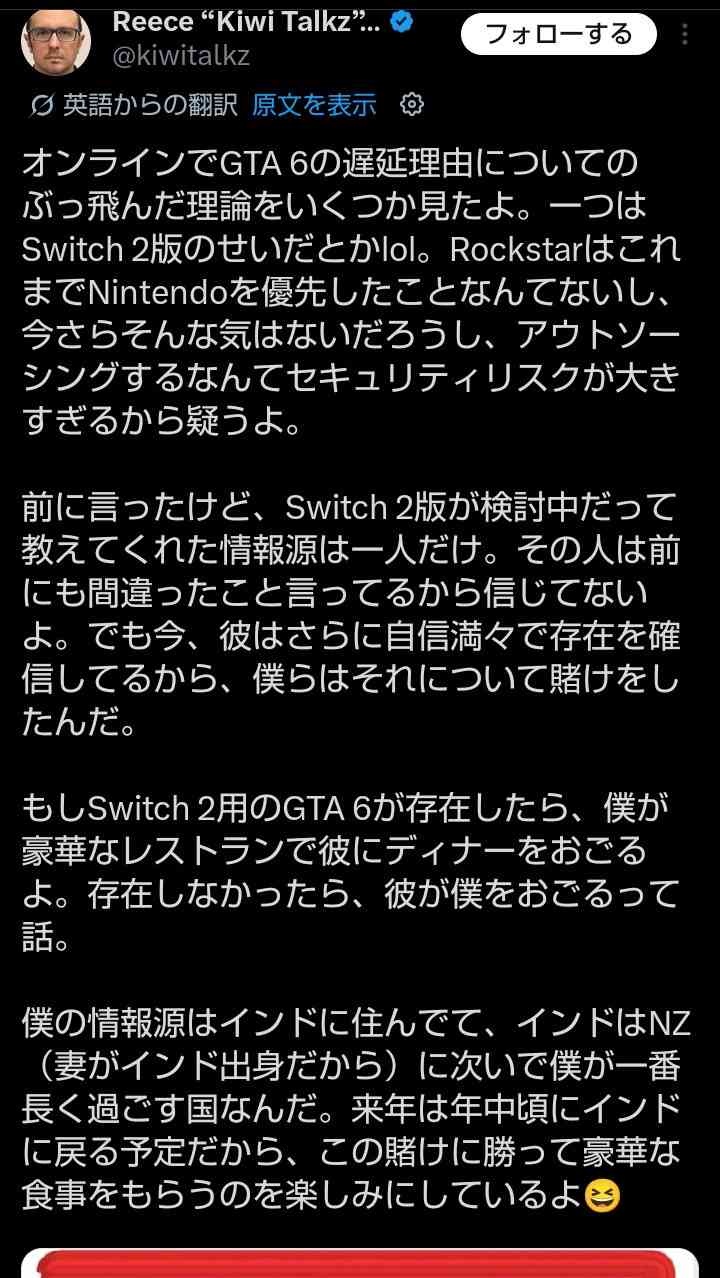 もしSwitch 2用のGTA 6が存在したら、僕が豪華なレストランで彼にディナーをおごるよ