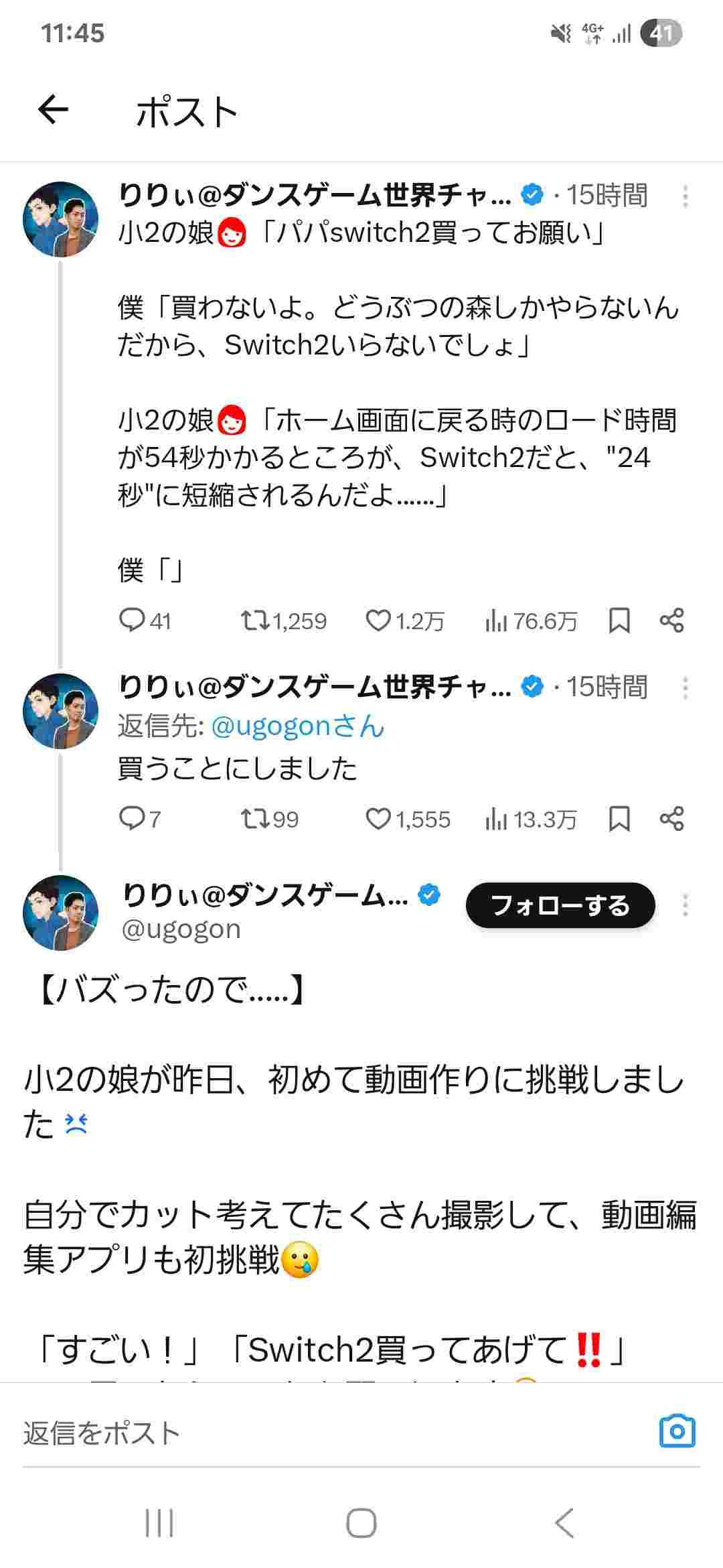 小4娘「あつ森のタイトルロード時間が54秒から24秒に短縮されるからSwitch2買って欲しい」
