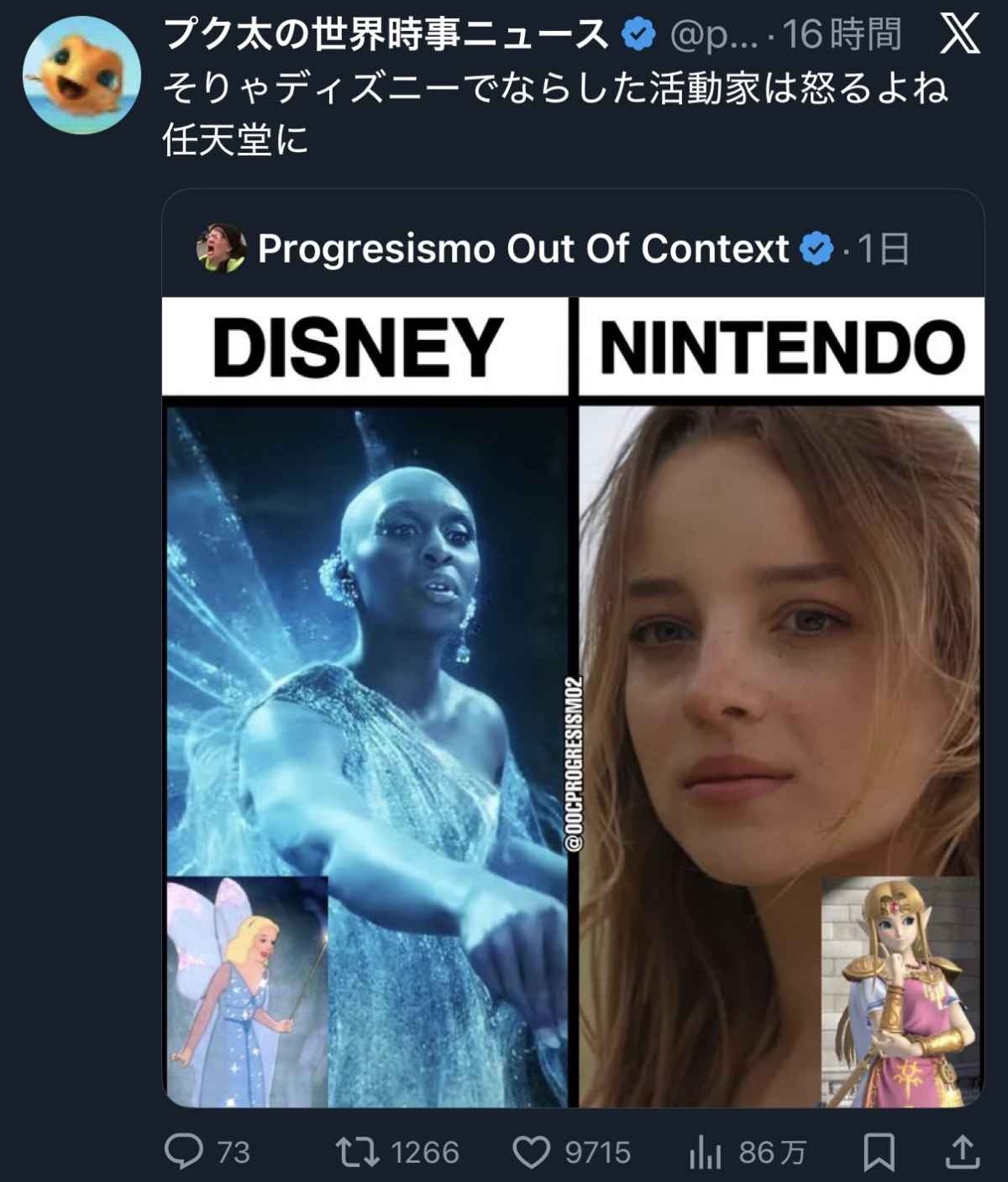 活動家、任天堂にブチギレ「ポリコレを全く理解してない。ディズニーを見習え」