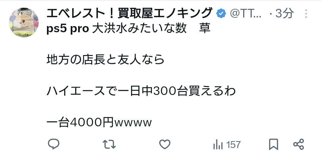 - 国内でいつでも余裕で買えるPS5proを転売価格で買う人間なんていないから100%海外行き