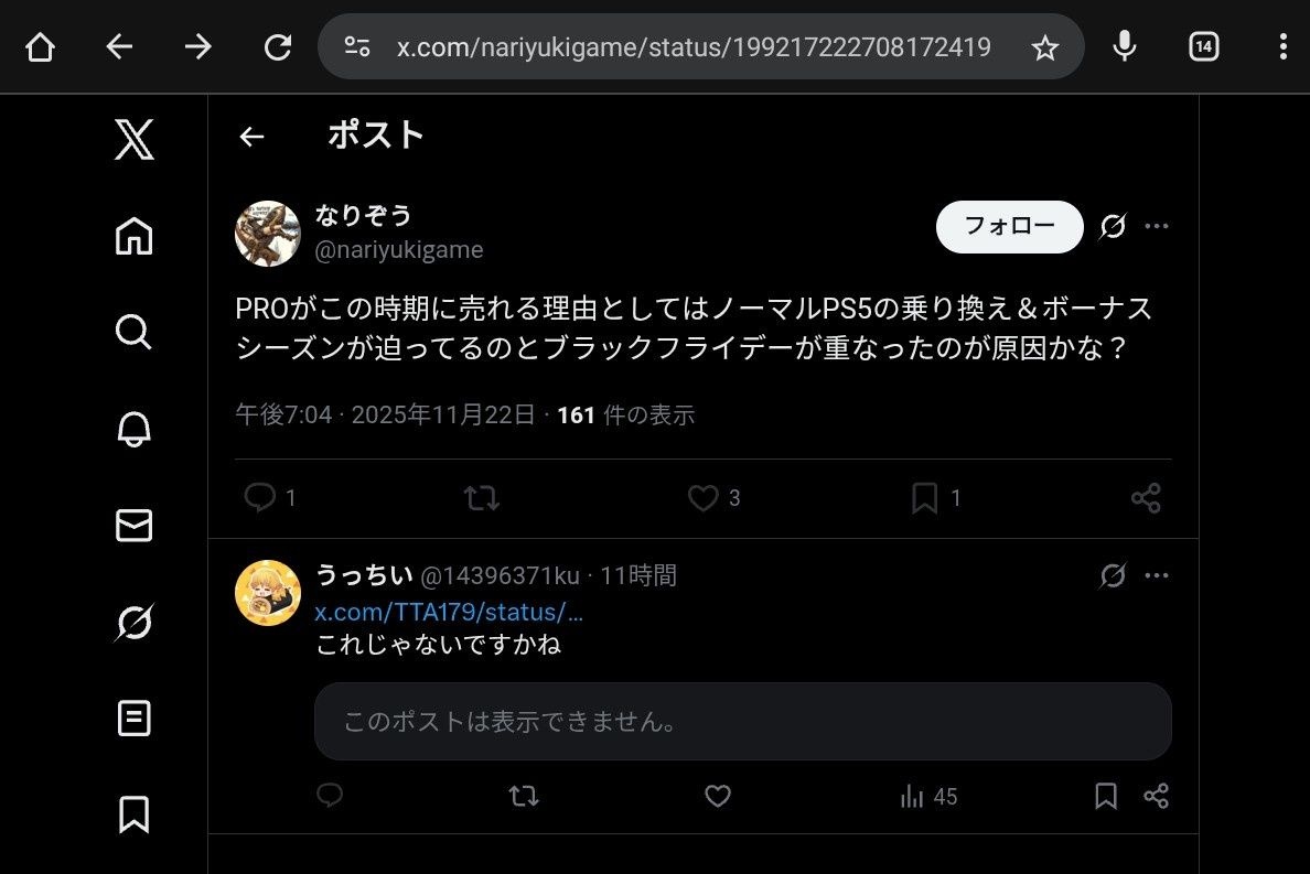 PROがこの時期に売れる理由としてはノーマルPS5の乗り換え&ボーナスシーズンが迫ってるのとブラックフライデーが重なったのが原因かな? - 2 : 2025/11/24(月) 07:51:04.48 ID:+GSaGH+z0