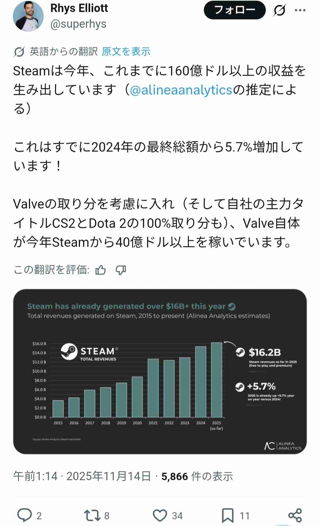 Steam運営会社Valve、今年度売上が既に162億ドル(2兆5400億円)を超え、ウィンターセール前に前年超えwww