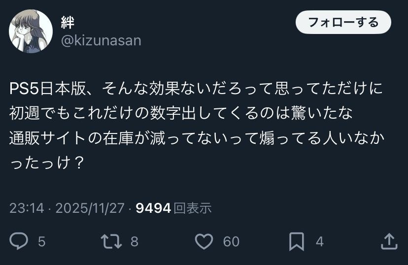 PS民「PS5日本、効果ないだろって思ってたけど初週でもこれだけの数字出してくるのは驚いた」