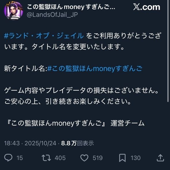 とあるゲーム、タイトルを突然『この監獄ほんmoneyすぎんご』に変更し大荒れ