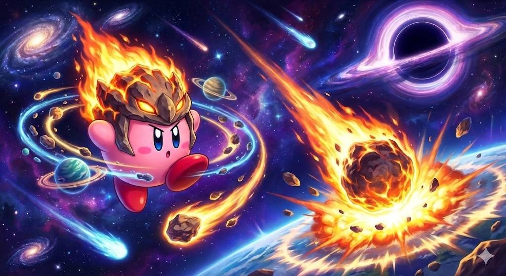【見た目】 小さな惑星の輪っかがカービィの周りを回っており、頭には燃え盛る岩石のような帽子。