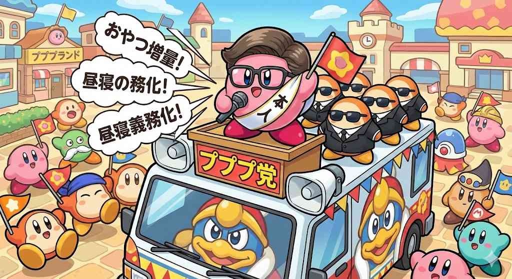 • 「国民(プププランドのみんな)のために立ち上がれ! 清き一票、星の弾丸。公約守って、悪を討つ! 支持率急上昇中の ニューリーダー、ここに誕生!」
