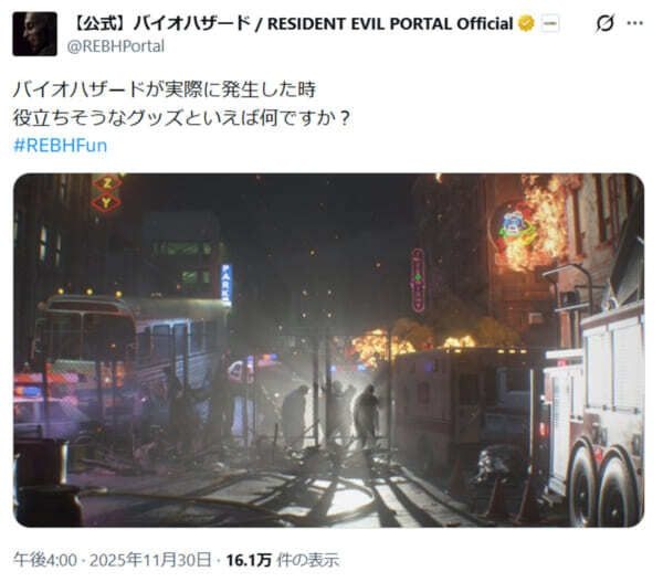 カプコン公式「バイオハザード」アカウントが、「バイオハザードが実際に発生した時、役立ちそうなグッズといえば何ですか?」と問いかける投稿を行い、SNSで大きな反響が広がっています。