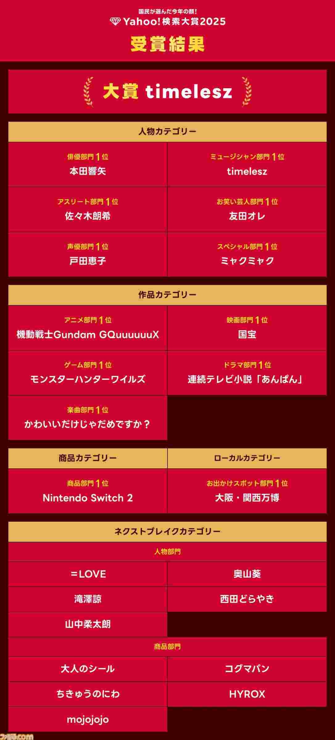 - “Yahoo!検索大賞2025”商品部門でNintendo Switch 2が1位に。『モンハンワイルズ』『ガンダムジークアクス』がゲーム部門・アニメ部門で首位を獲得