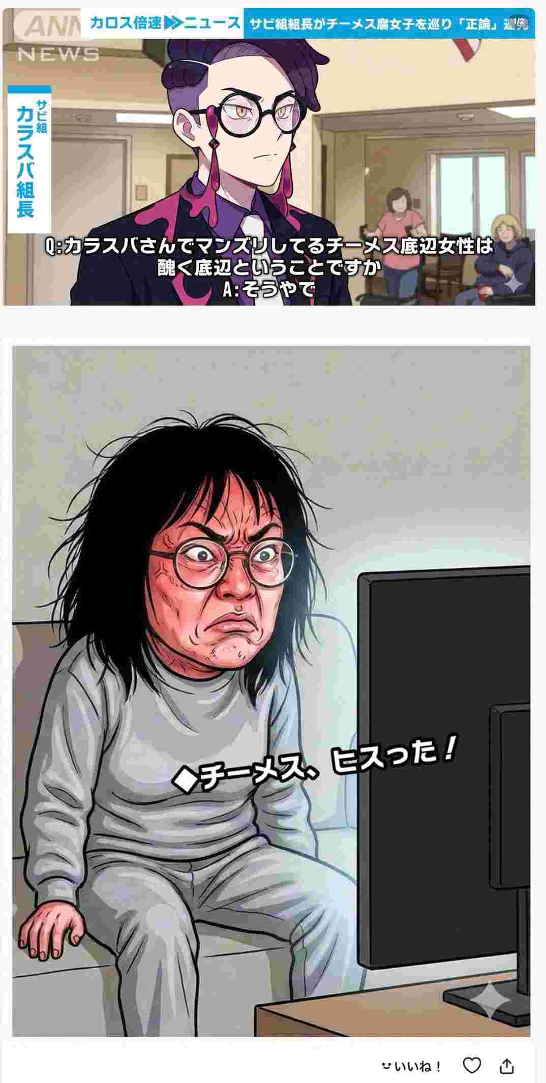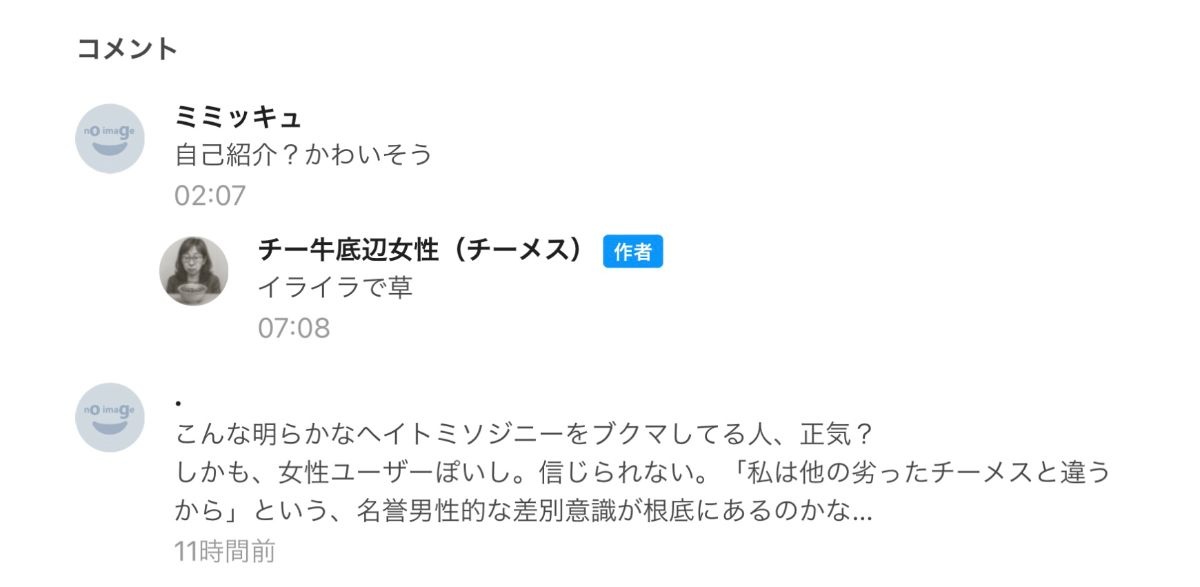 チーメスさんは自分が批判されるとすぐヒスってお気持ち表明からおもろいねQ:チーメス底辺女性は醜く底辺ということですか? A:そうやで
