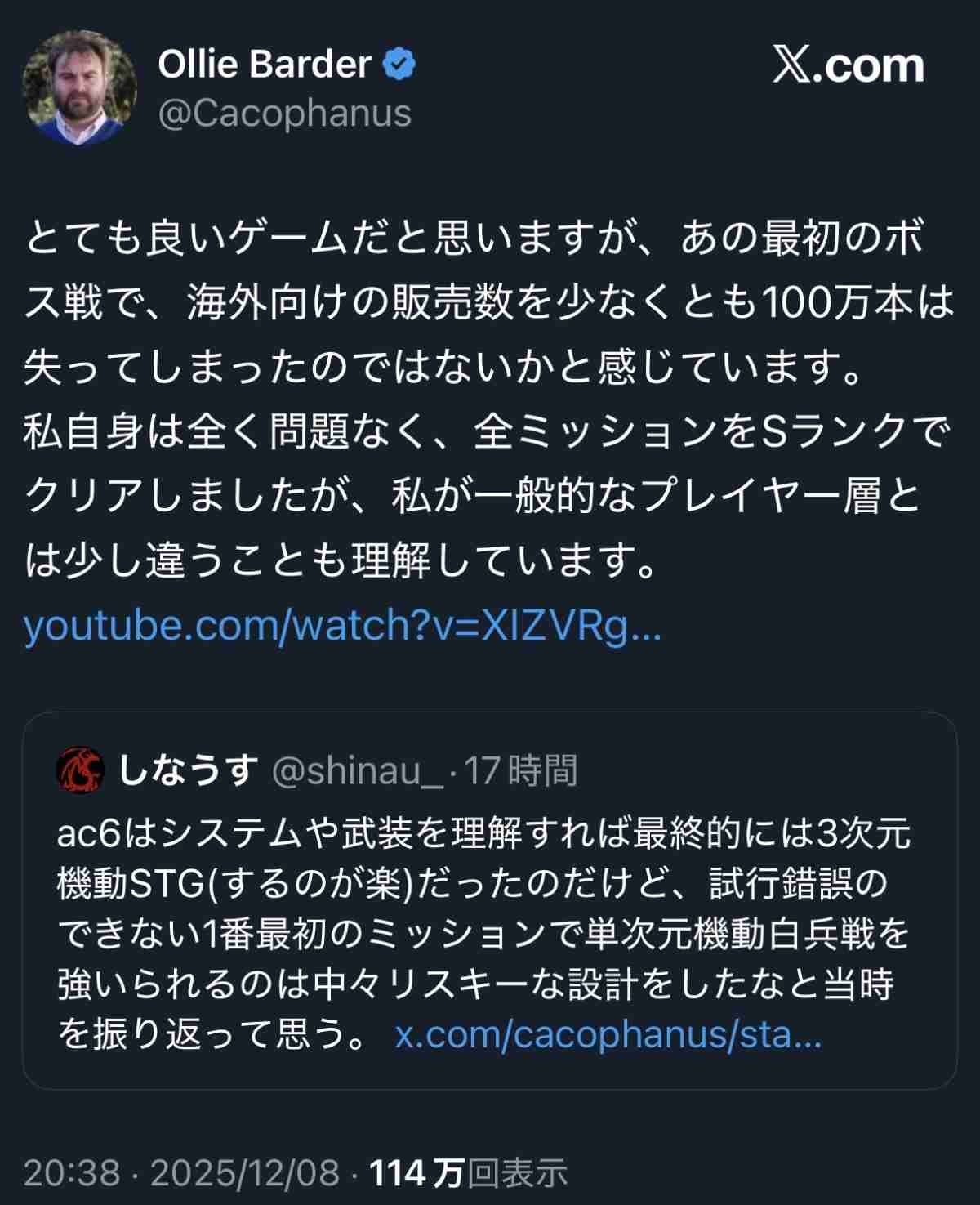 海外の有名ゲームデザイナー「AC6は最初のボス戦の作りが失敗。あれで100万本の販売の損失」