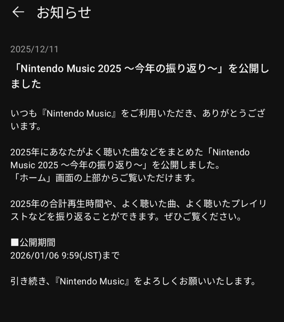 ニンテンドーミュージックに今年の振り返り機能が追加!