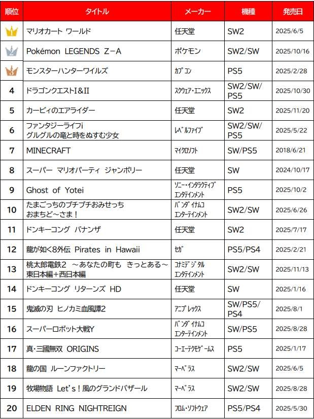 - >『モンスターハンター ワイルズ』が3位にランクインし、年間を通じてロングセラーとなり市場を支えた。