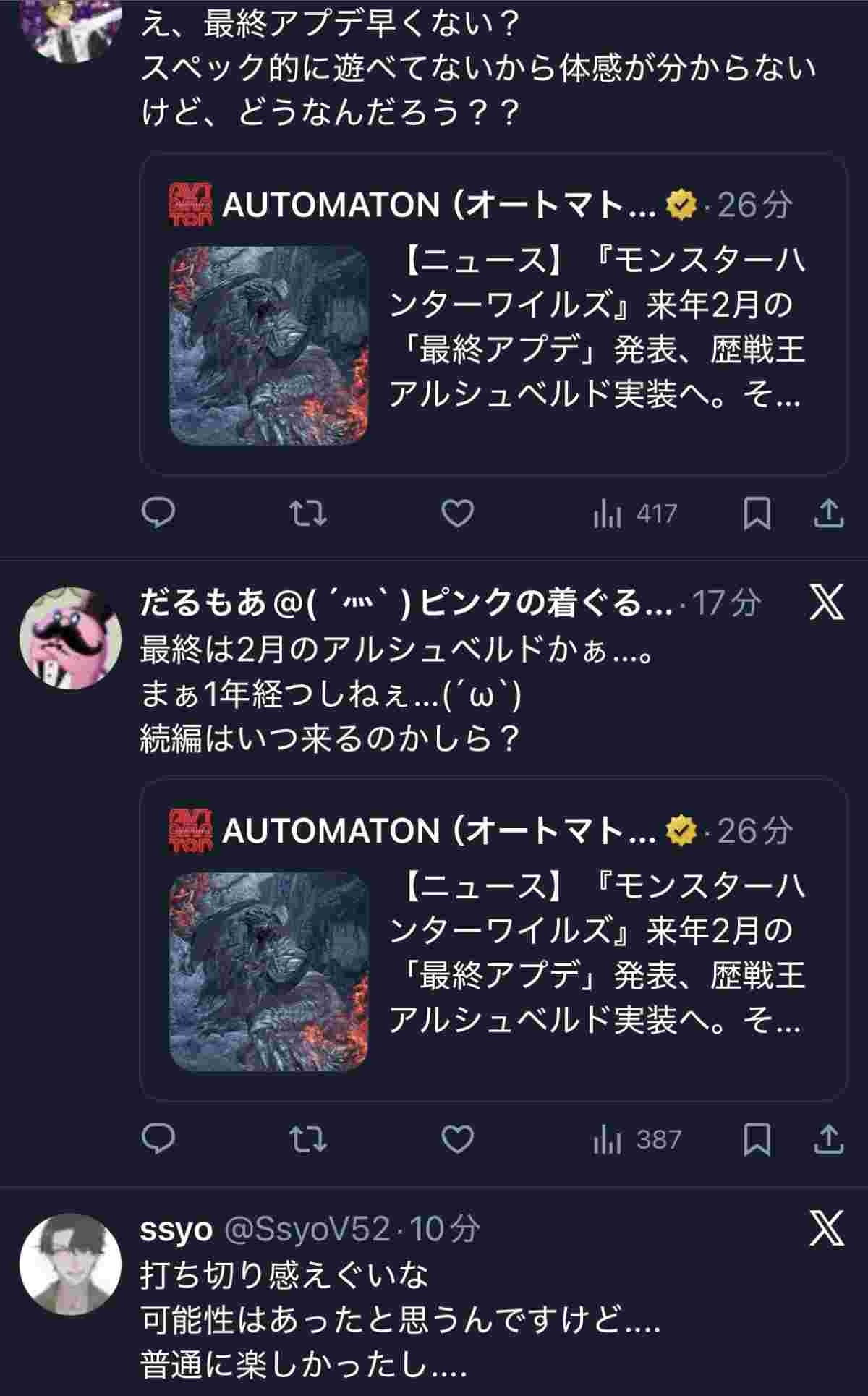 - 来年の2月にワイルズ最終アプデ、3月にストーリーズ3発売、夏にサンブレイクのスイッチ2エディション発売、秋にモンハン次回作発表、27年に発売って感じになると予想してみる
