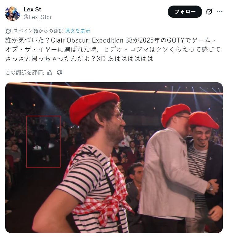 - 小島監督、GOTYに招待されるも一つも受賞せず。ただ33が受賞しまくるのを眺めるだけ