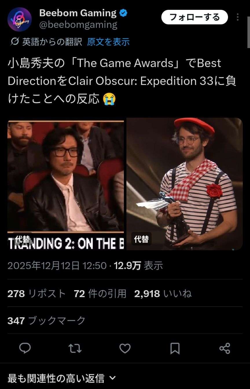 もうひとつ教えてやるとお前が自信満々に貼った動画はGOTY発表の場面じゃないぞ - 56 : 2025/12/12(金) 20:29:27.341 ID:Fu5CPmWRB