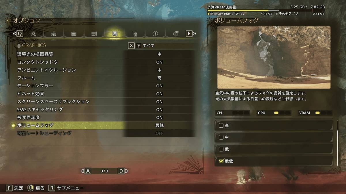 ・グラフィック設定:中検証に使用した上記PC環境において、現在は負荷のかかりやすい異常気象中の「隔ての砂原」では、