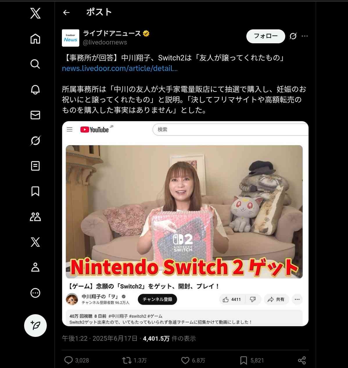 - Switch2は中川翔子以外も愛用してるしそもそも中川翔子は転売説で炎上してSwitch2出しづらくなってる人間だろ