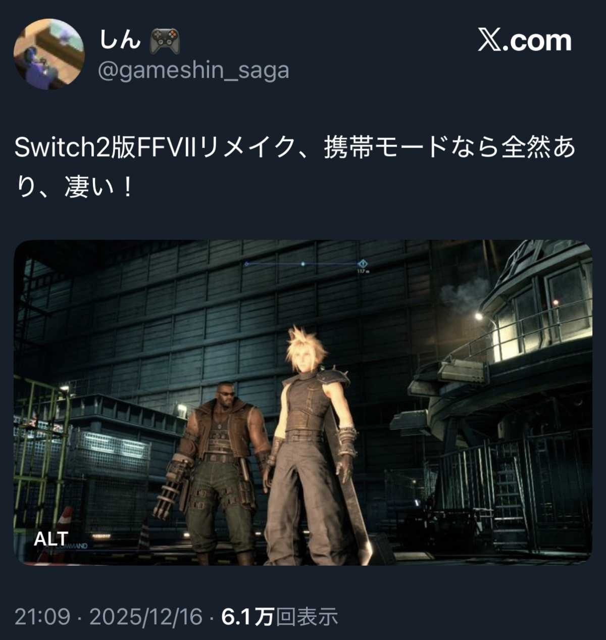 FF7Rで「Switch2でいい」の認識が世界共通になる。PCとPSは障壁確定