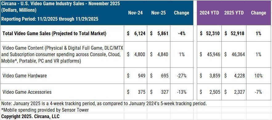 ハードウェア – PlayStation 5は、11月の販売台数と販売金額の両方でベストセラーハードウェアとなり、これはNintendo Switch 2の発売以来初めてのことです。Nintendo Switch 2は、11月の販売台数と販売金額の両方で第2位となりました。