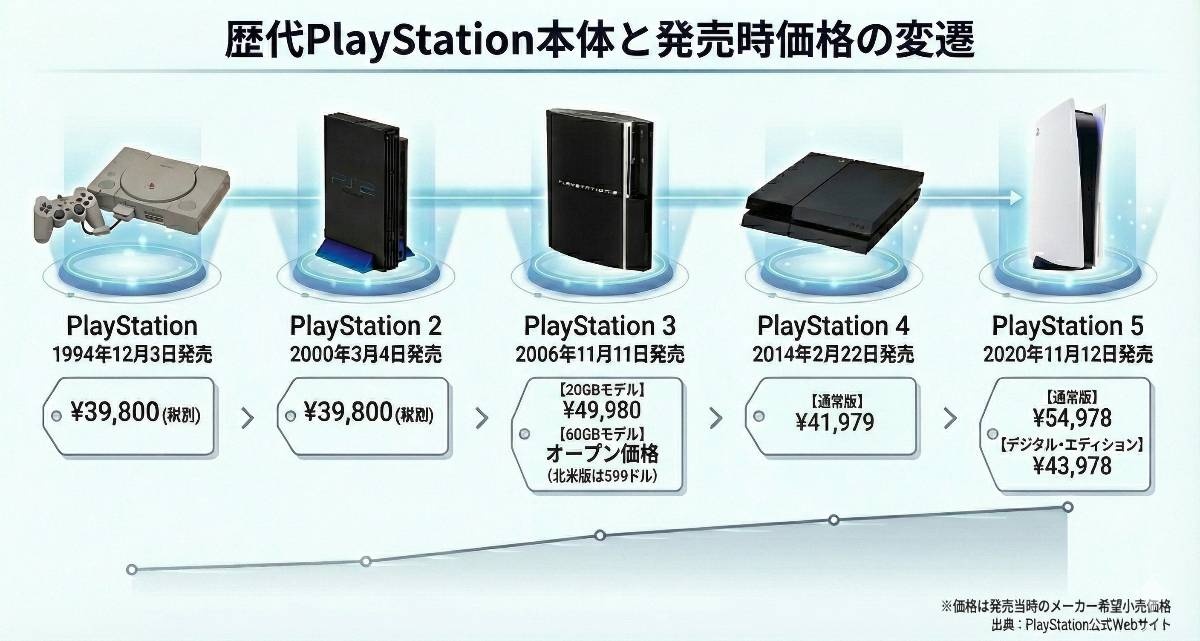 初代PS・PS2は3万9980円(ともに税別)、PS3は4万9980円、PS4は3万9980円で発売し、その後大幅に値下げしている。