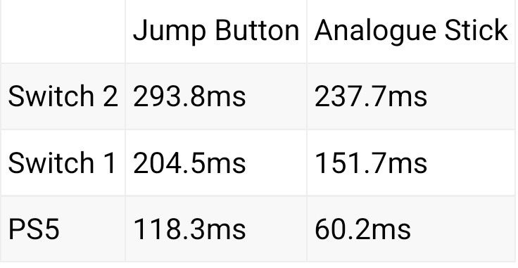 - また、Switch 2のテスト結果は、Switch 2 ProコントローラーとJoy-Con 2コントローラーのどちらでテストしても、また有線接続と無線接続のどちらを使用しても、目立った変化はありませんでした。