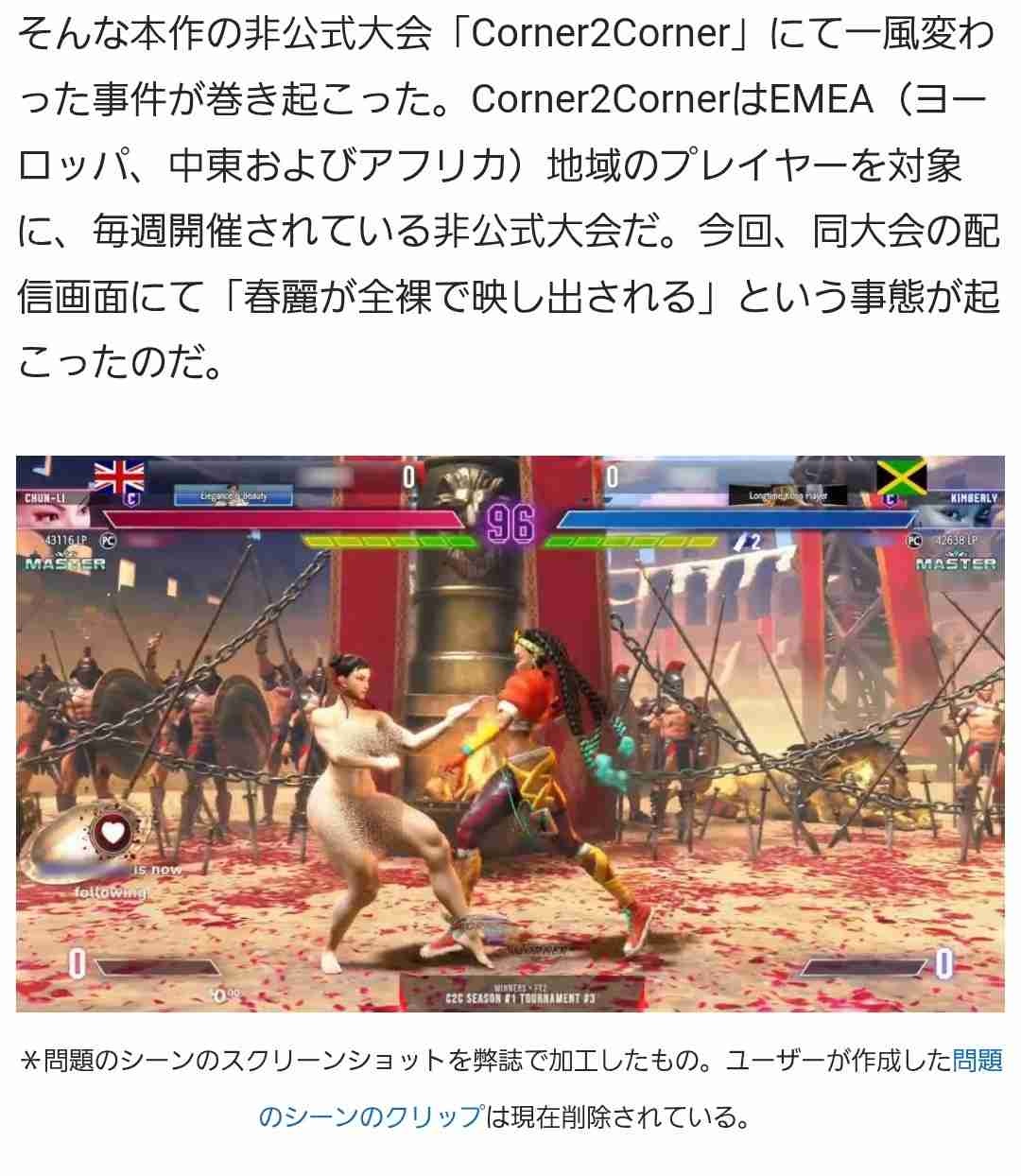 - 春麗が全裸で映し出されてしまった原因は、試合を観戦していたホスト役プレイヤーが該当のModを導入していたためだという。つまり試合に参加している選手は無関係で、ホストを介した配信用の画面でのみ全裸の春麗が反映されていたと見られる。なお配信画面はすぐさま切り替わったほか、大会実況者たちも異変に気づき「とても興味深い春麗のコスチュームだね……」と皮肉交じりにコメントして“放送事故”の空気を和らげていた。
