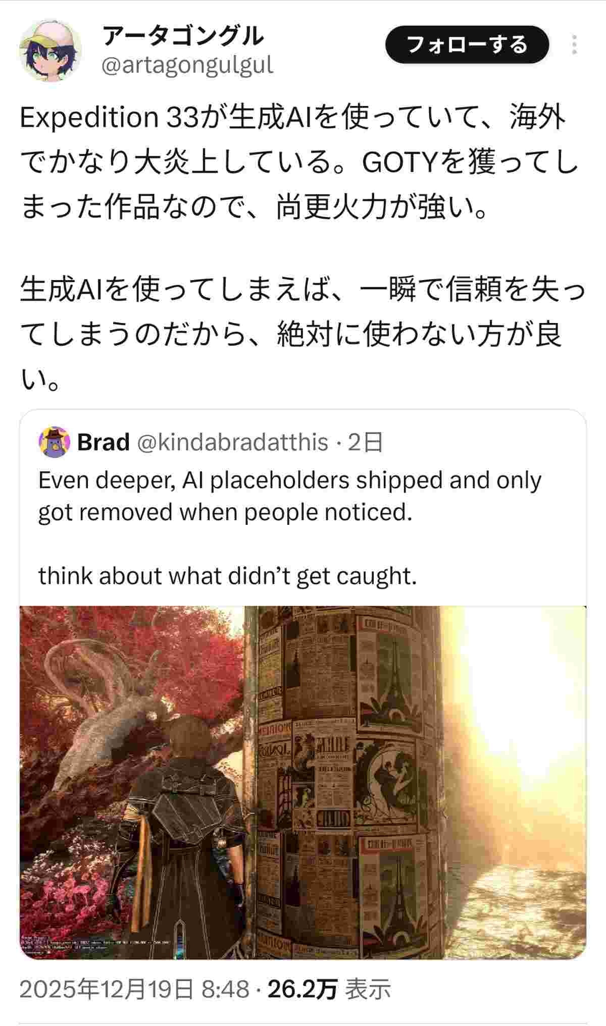 ただ実際に使ってるならSteamのストアページにその旨表記する必要があるので隠してたことが叩かれてる感じか? - 30 : 2025/12/19(金) 23:22:09.98 ID:cNqY1pFD0