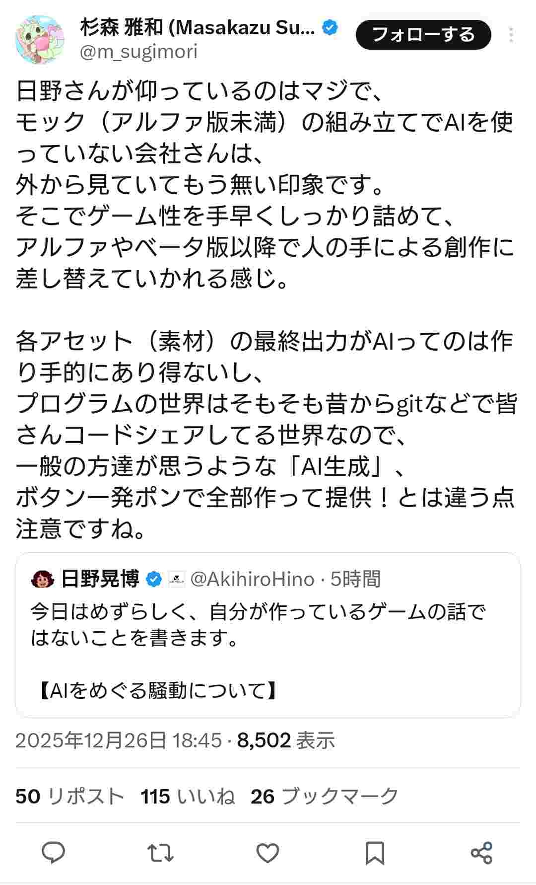 元カプコン杉森「もうAIを使ってない会社は存在しない、反AIの自称クリエイターは偽物」