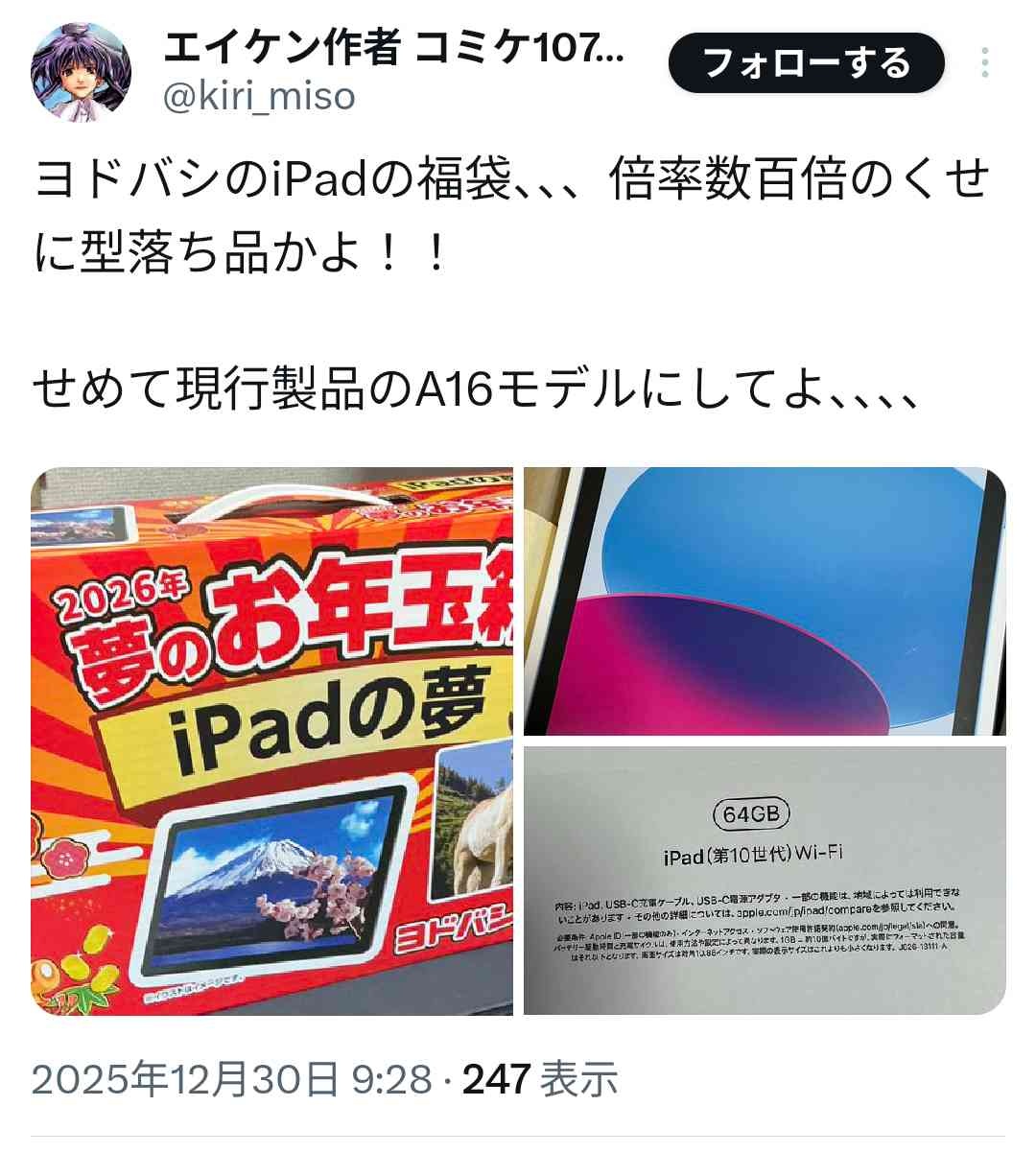 ヨドバシの福袋「iPadの夢(4万円)」、型落ちROM64GBのゴミだと判明www